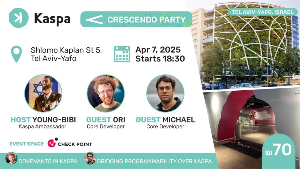 Kaspa is set to host a meetup in Tel Aviv on April 7th, focusing on exploring covenants, smart contracts, and security.
