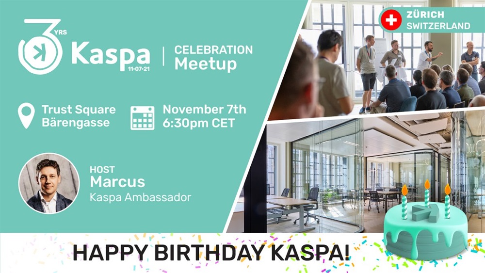 Kaspa will celebrate its third anniversary with an event in Zurich on November 7th from 17:30 to 20:30 UTC.