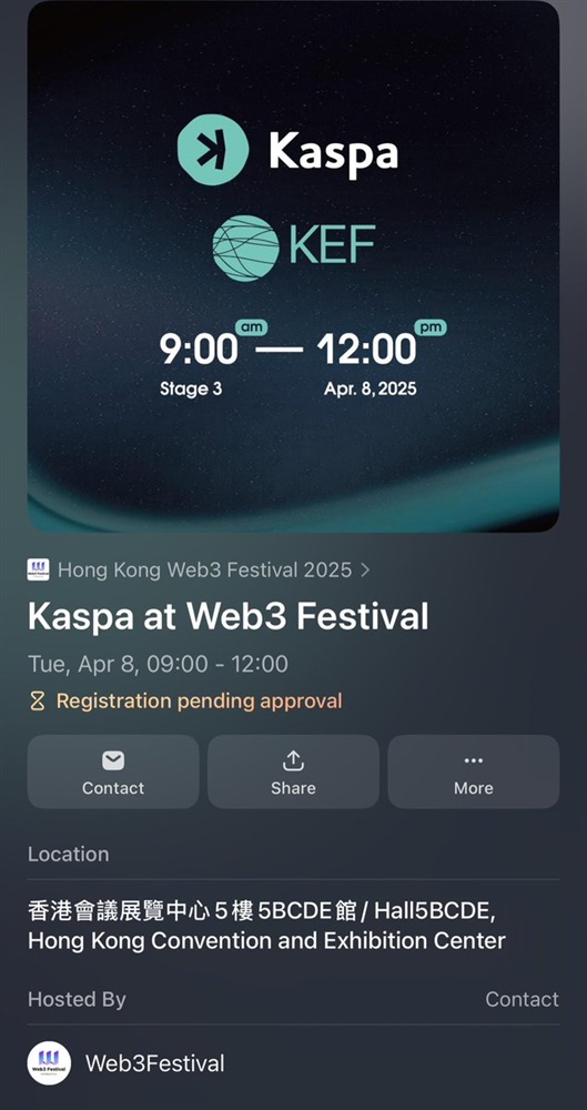 Kaspa will be featured at the Web3Festival in Hong Kong, sponsored by the Kaspa Eco Foundation (KEF). The event is scheduled for April 8th.