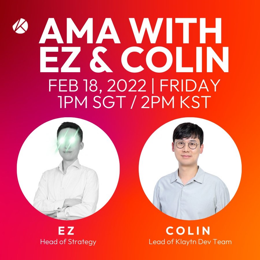 In light of our recent announcement about gas price adjustment, we'll be having an AMA session on 18th Feb, 1pm SGT/2pm KST with EZ, head of strategy and Colin, lead of the #Klaytn Dev Team! 😊 Leave your questions in the comments section now~ 😄🔥