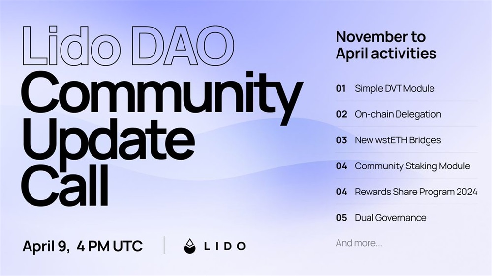 Lido DAO is set to hold its first community call on April 9th at 4 pm UTC. The purpose of this call is to provide updates on the developments and future plans of Lido DAO.