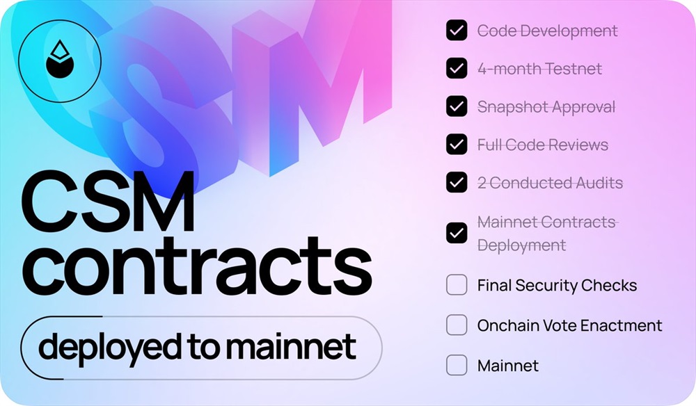 The CSM contracts are now deployed on Ethereum and are scheduled to go live next week via an on-chain vote, introducing solo staking capabilities.