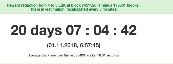 Reward reduction from 4 to 3 LSK at block 7451520 (T minus 175361 blocks).