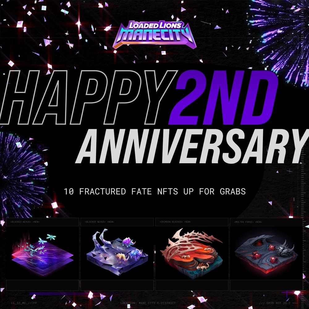 Loaded Lions states that, in observance of Mane City’s second anniversary, a giveaway of ten Fractured Fate Land NFTs will commence shortly; precise scheduling details have not been disclosed.