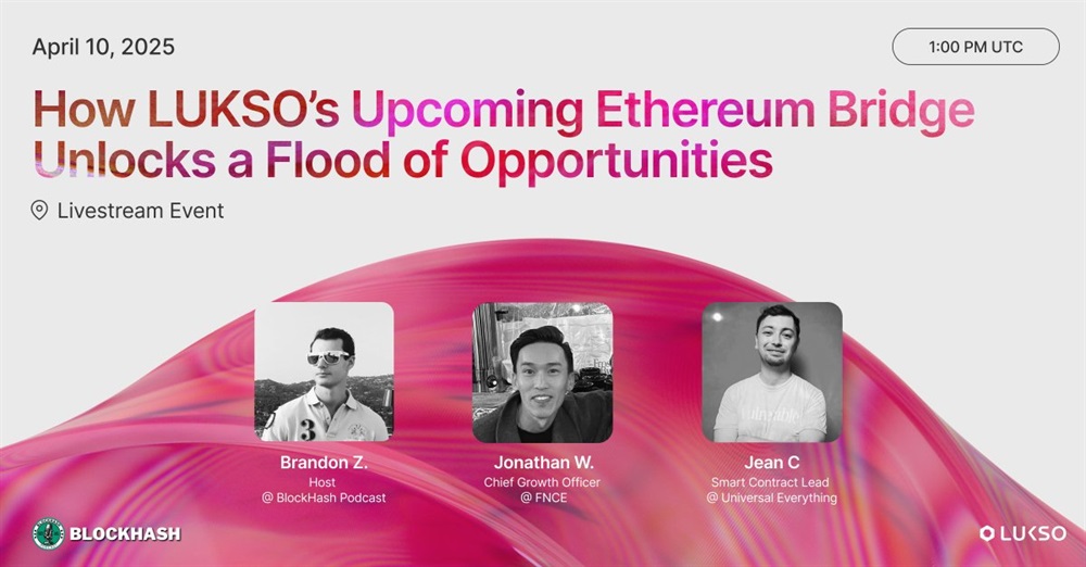 LUKSO will host a live stream on YouTube discussing its upcoming Ethereum bridge and the potential to unlock new opportunities. The event is set for April 10th at 13:00 UTC.