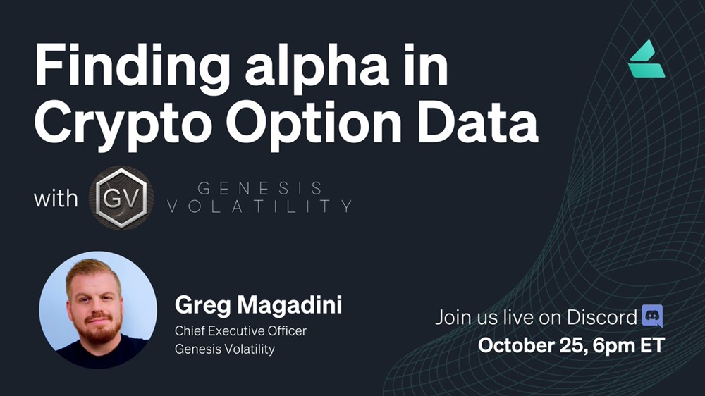 Learn how to find alpha in crypto option data with Greg Magadini, CEO of @GenesisVol, live from Discord this Tuesday 25th October 6pm ET.