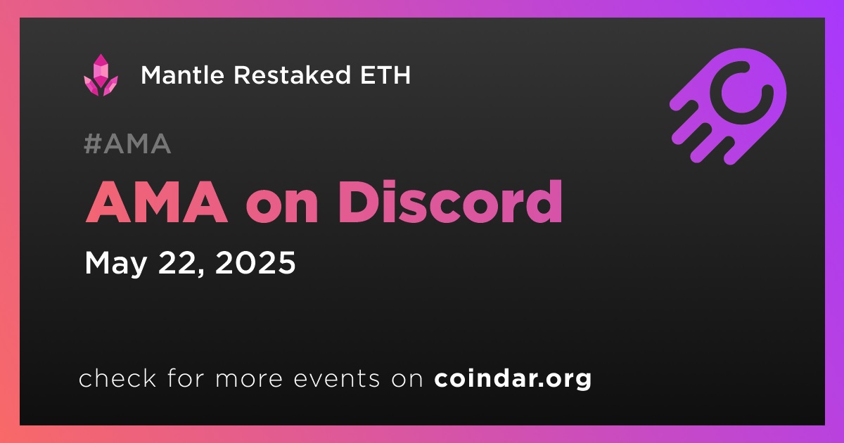 Mantle Restaked ETH will hold an AMA on Discord on May 22nd at 15:00 UTC. The event is intended to introduce newcomers to the project and will include a preview of the bounty scheduled for release the following week.