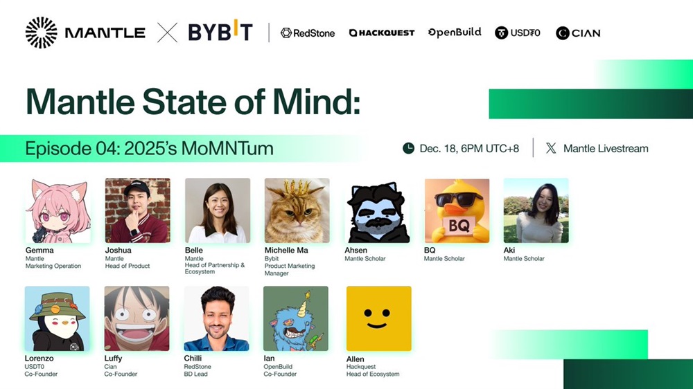 Mantle Staked Ether will hold an AMA on X on December 18th at 11:00 UTC. The broadcast will recap Mantle’s 2025 MoMNTum, ecosystem milestones, RWA-related developments, community initiatives, and recent collaborations across the Mantle ecosystem.