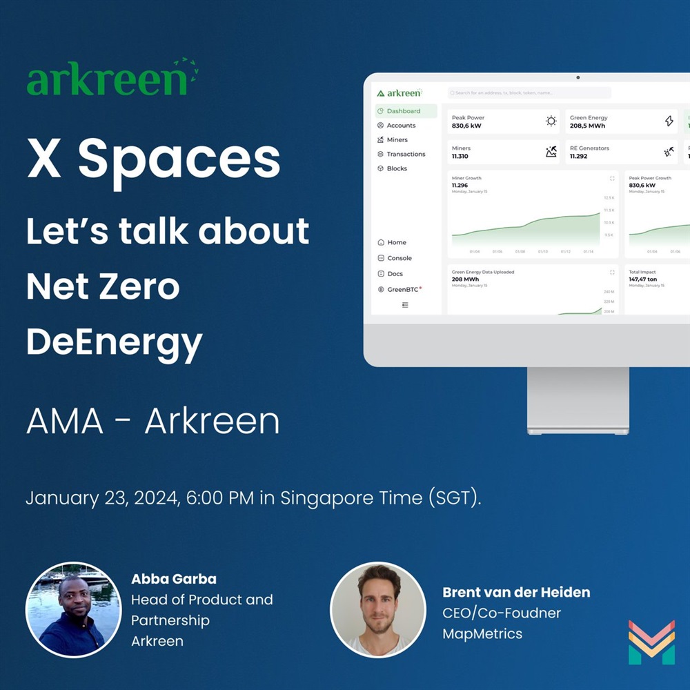 MapMetrics will host an AMA on X with Arkreen on January 23rd. The discussion will revolve around DePIN, a project aimed at transforming homes into eco-friendly mining facilities while promoting energy awareness.
