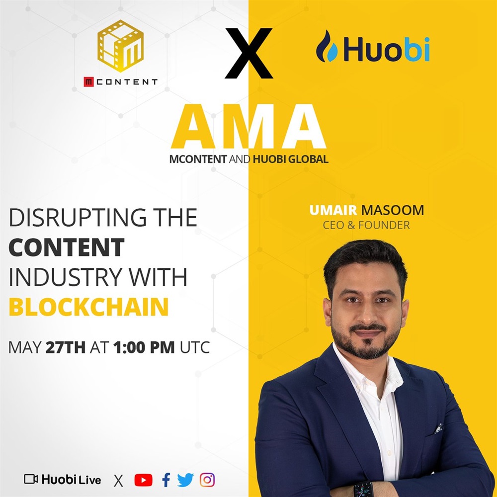 Don't miss today's big #AMA with our partners at Huobi Global featuring #MContent Founder & CEO Umair Masoom & MContent COO Somair Rizvi for yet another huge announcement!