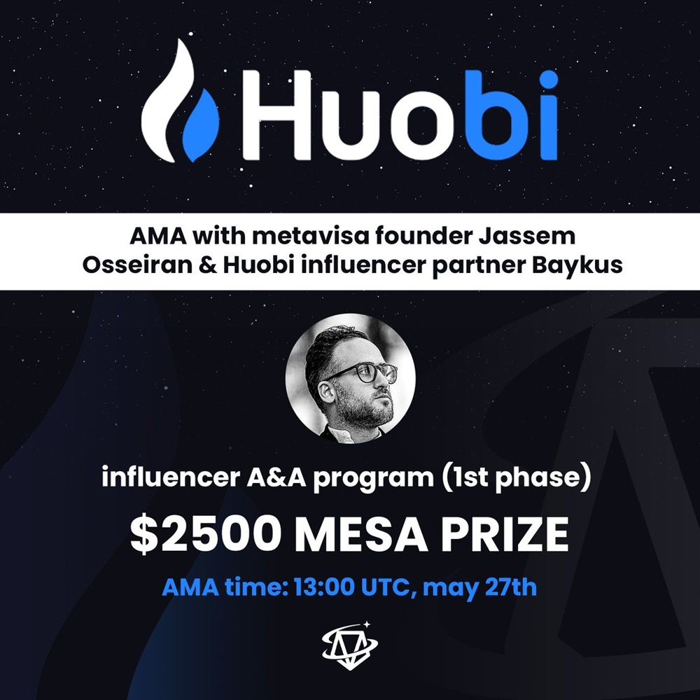 Join #metavisa founder Jassem Osseiran & @HuobiGlobal influencer partner Baykus for an AMA 13:00 UTC, May 27th over on Twitter Spaces