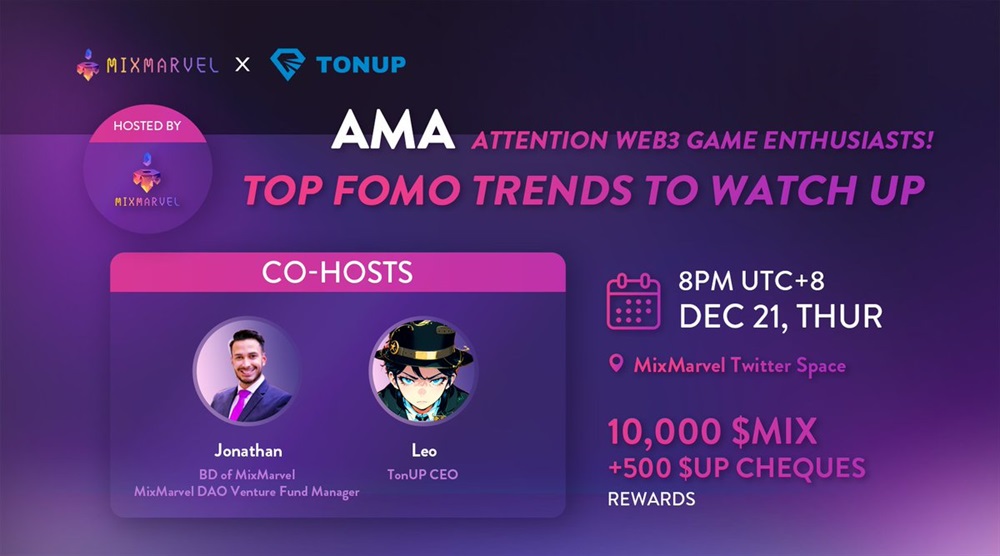 MixMarvel will host an AMA on X on December 21st at 12:00 UTC. The topic of discussion will be ”Attention Web3 game enthusiasts! Top FOMO trends to watch up".