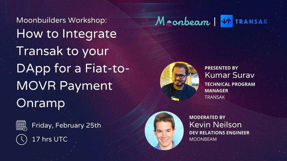 The Moonbeam & @transak_ teams will show you how to integrate Tansak to your dApp for a fiat-to-MOVR payment onramp!