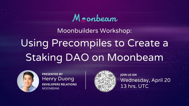 👥 Join us this Wednesday for the next Moonbuilders Workshop, including a technical demo on using precompiles to deploy a staking DAO dApp on Moonbeam! 🔥