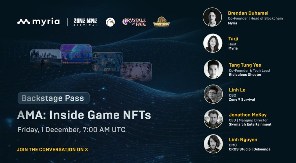 Myria will host an AMA on X with its studio partners on December 1st at 7:00 AM UTC. The discussion will focus on game NFT creation and the industry.