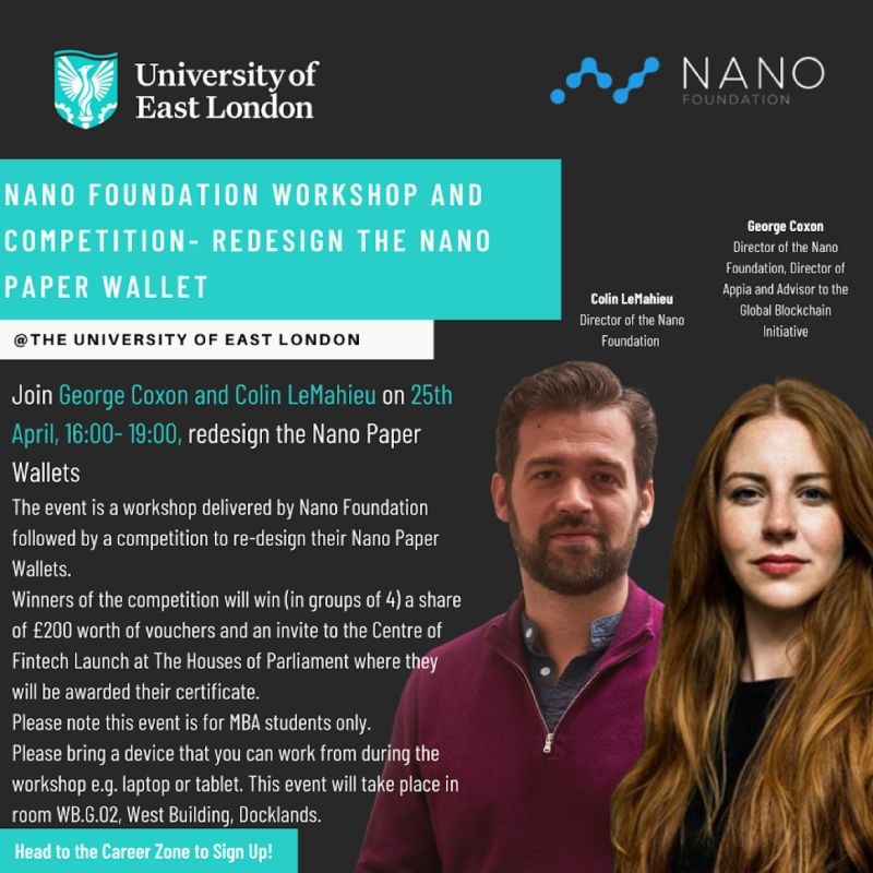 Today, MBA students will be brainstorming #nano paper wallets designs! 📝 This workshop will be led by George Coxon and @ColinLeMahieu Thanks, @UEL_News, for organizing this! 🗓️ Mon, 25 April. 4-7 pm at USS Campus. 👉 Register bit.ly #FinTech $XNO @SBL_UEL