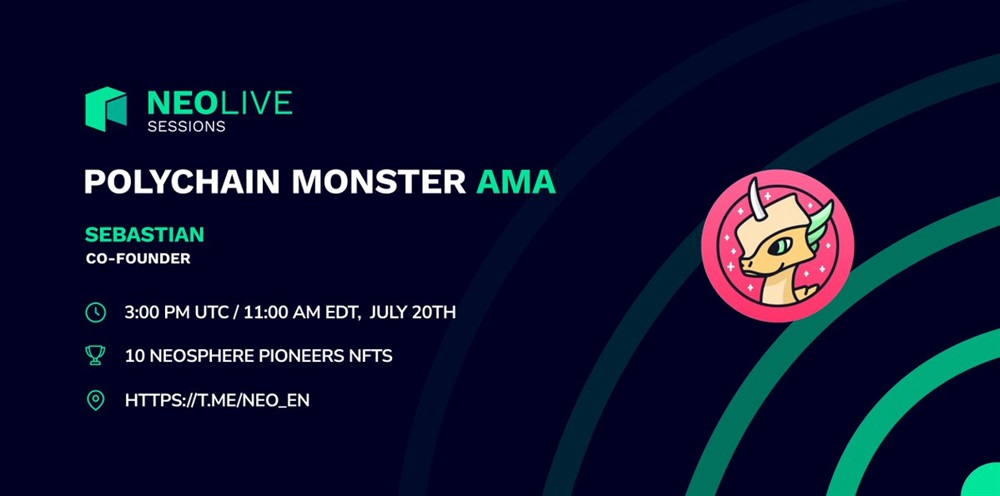 NEO is hosting an AMA on Telegram with the Co-Founder of Polychain Monsters on July 20th at 15:00 UTC. The discussion will revolve around the concept of Polychain Monsters, a collection of NFTs, and how users can engage with them. Additionally, there will be a chance to win special NFT gifts during the session.