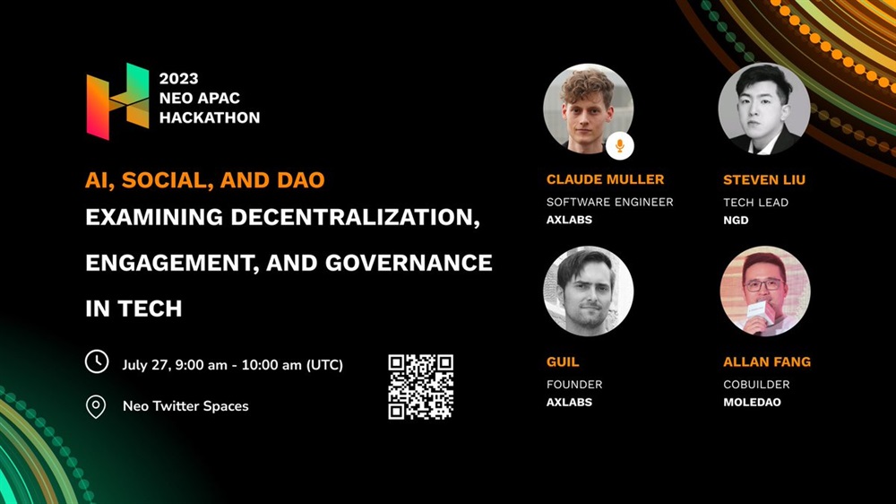 NEO will host a panel discussion on Twitter within Neo APAC Hackathon. This event is a platform for showcasing the integration of intelligent algorithms, interconnected communities, and decentralized decision-making. The discussion is scheduled to take place on July 27, from 9 to 10 AM UTC.