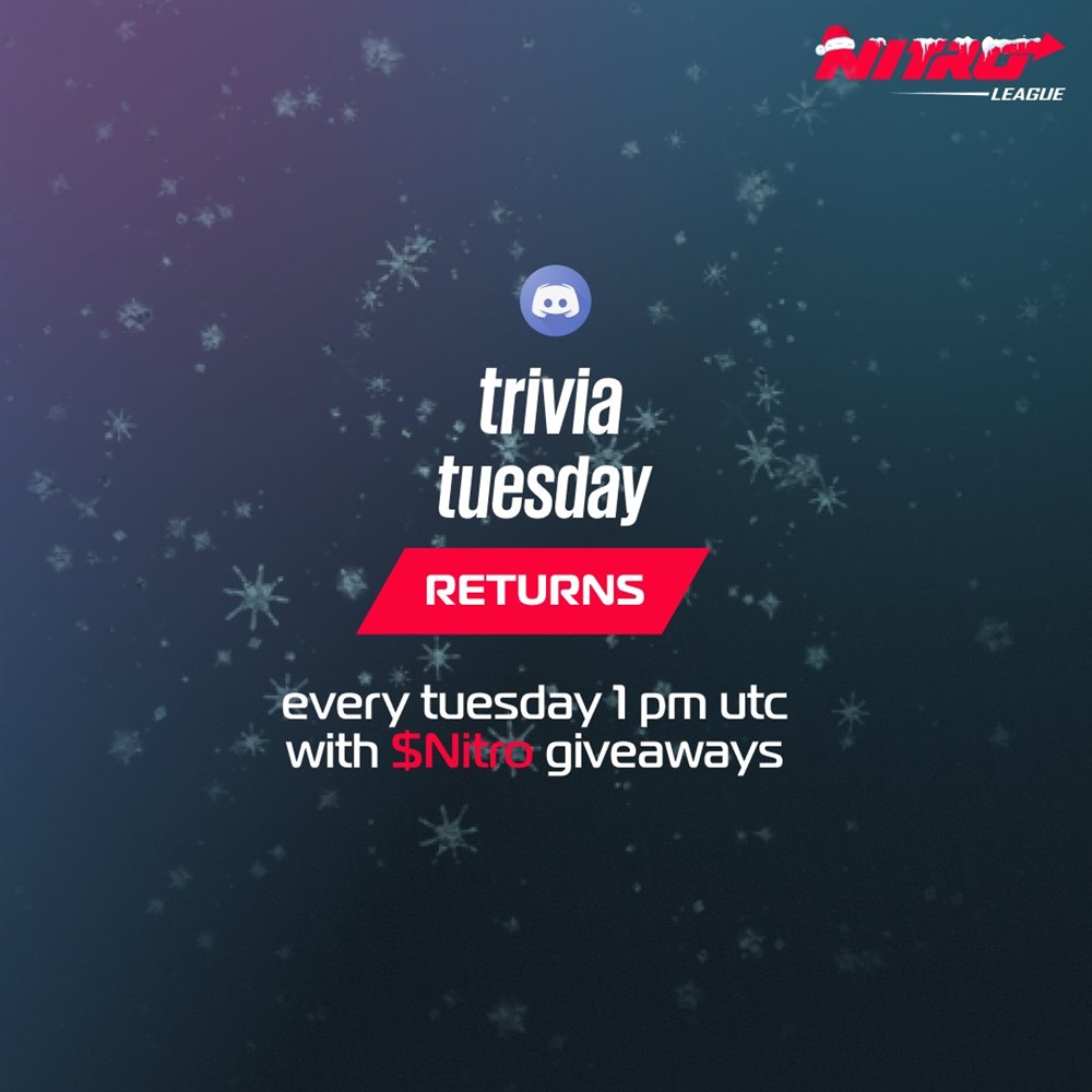 Trivia Tuesday is back! Join us tomorrow for your chance to win Nitro tokens! Put your knowledge to the test and prove you're the smartest of them all. Don't miss out - see you soon!