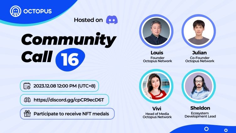 Octopus Network will host a community call on Discord on December 8th at 12 pm UTC. The call will focus on the latest developments of Octopus 2.0 and Ottochain. Participants will also have the opportunity to earn an exclusive NFT medal.