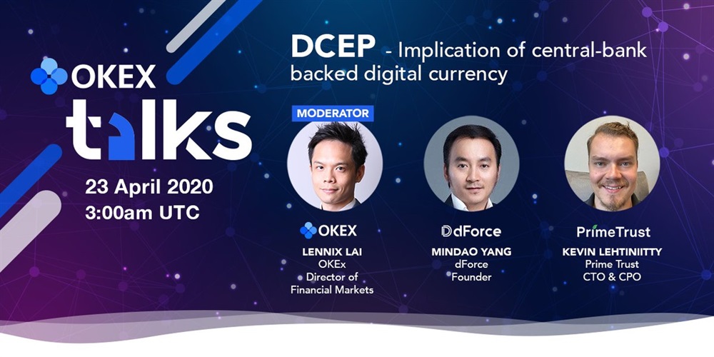 VIRTUAL EVENT: Join us Apr 23 for the 1st ever #OKExTalks Webinar 🌐 - discussing #DCEP & more! Great line up sharing their insights: @LennixOkex Financial Markets Director, @mindaoyang Founder @dForcenet, @KevLeht CTO & CPO @PrimeTrustCo.