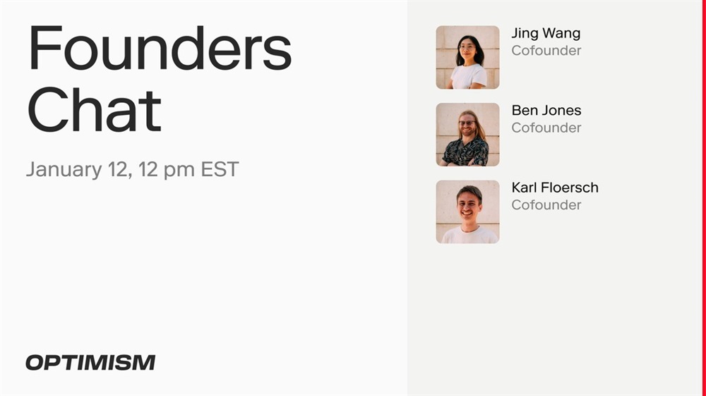 Optimism will host an AMA on X on January 12th at 17:00 UTC. The discussion features the cofounders, Jing Wang, Ben Jones, and Karl Floersch, and focuses on the proposed token buyback governance initiative, as well as the next stage of development for the Optimism ecosystem.