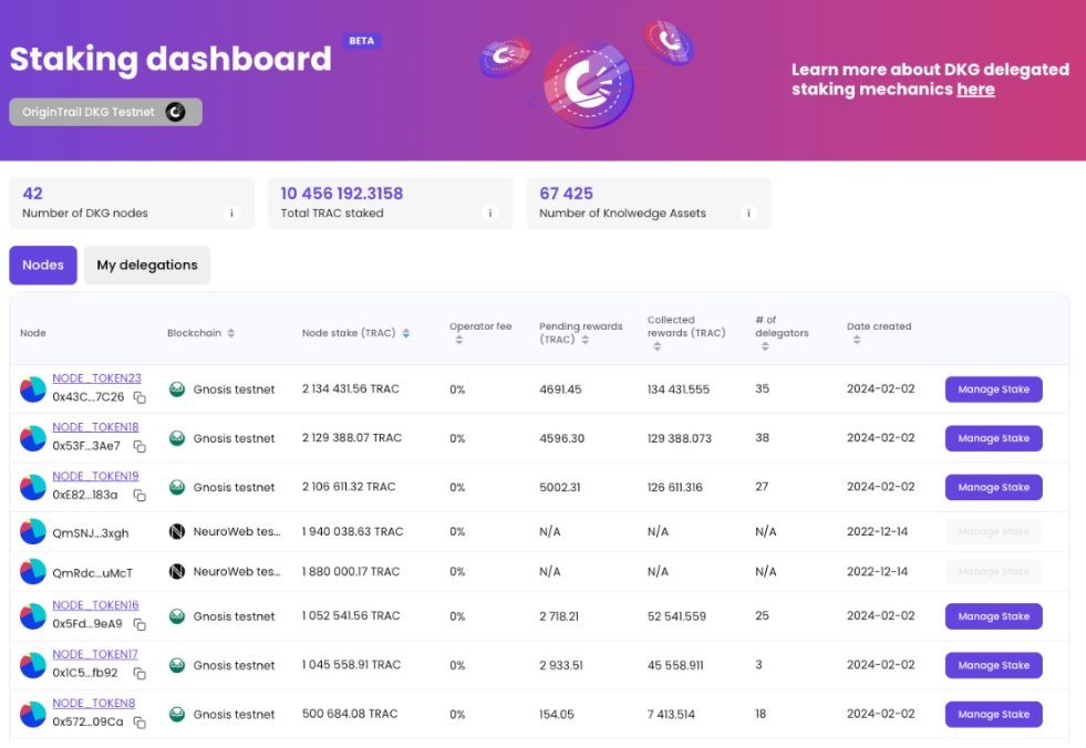 Delegated staking involves locking up $TRAC for contributing to the DKG security on selected DKG nodes. DKG node rewards are shared between the $TRAC stake delegators.