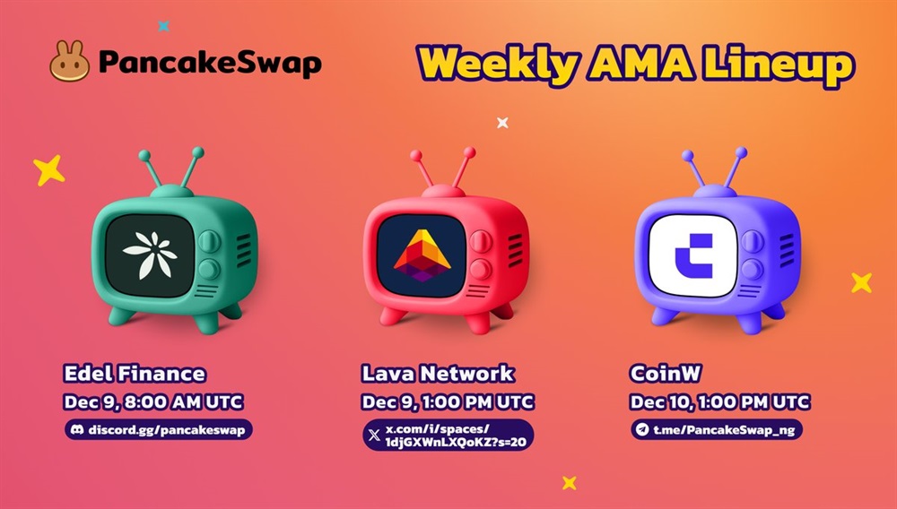 PancakeSwap launches a series of community sessions focused on on-chain infrastructure and next-gen financial tools. Edel Finance, Lava Network, and CoinW will present their projects across three live discussions on December 9–10, covering tokenized securities, high-throughput networks for dApps and agents, and future directions in trading and user experience.