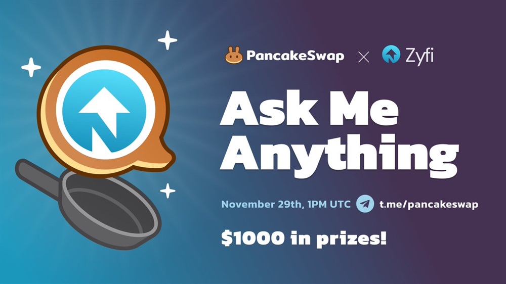 PancakeSwap will host an AMA on Telegram with Zyfi on November 29th, at 13:00 UTC. A prize of $1,000 in ZFI tokens will be awarded during the event.