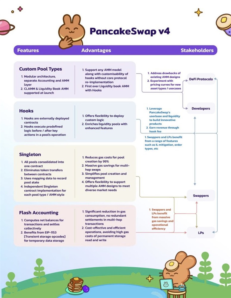 Additionally, PancakeSwap v.4.0 will introduce gas-saving Singleton and Flash Accounting. It will also be open-source, allowing for endless innovation in the DeFi space.