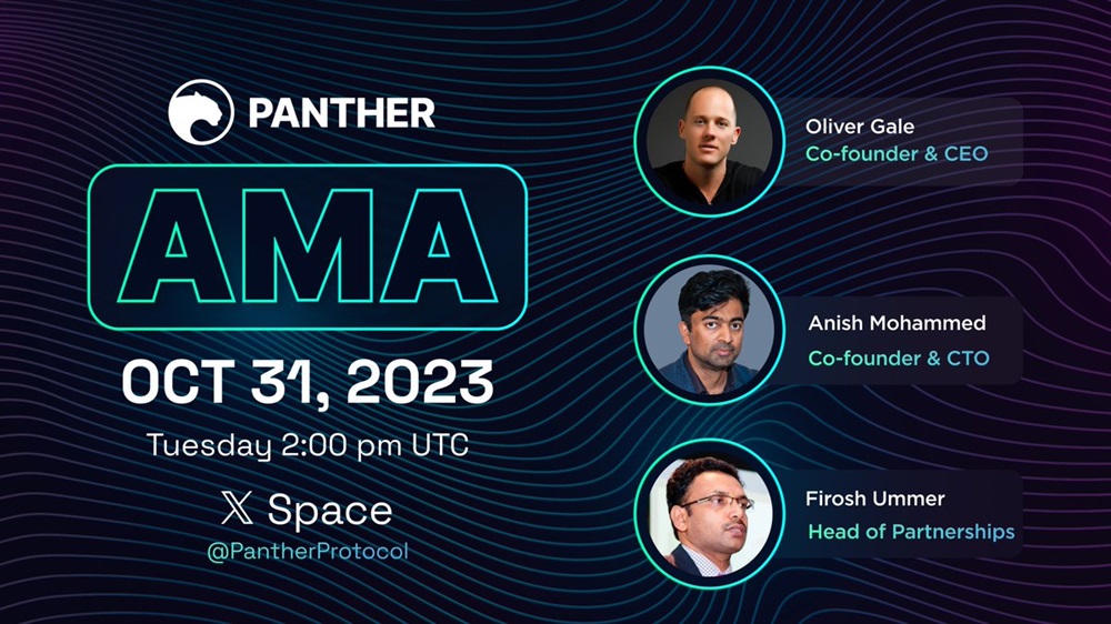 Panther Protocol is hosting an AMA on X with its co-founder and CEO Oliver Gale, co-founder, CTO, and chief scientist Anish Mohammed, and head of partnerships, Firosh Ummer. The session is set to take place on the 2nd of November at 2 pm UTC.