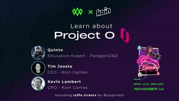 Join us on Twitch for an exclusive session with TimothyJ (Player1st) and Kevin Lambert of Koin Games (Player 1st) to learn more about Project O