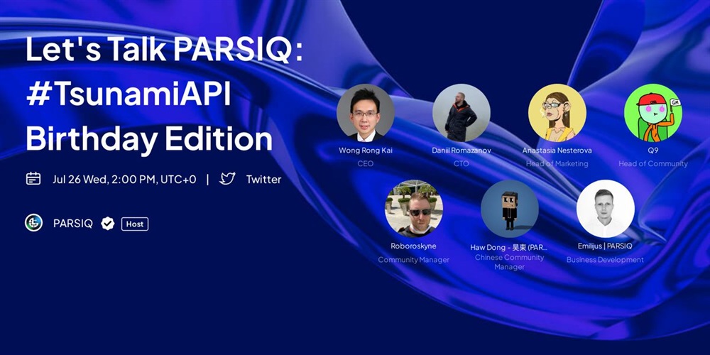 PARSIQ will host an AMA on Twitter, in celebration of the Tsunami API’s birthday. The event will feature the company’s CEO, Wong Rong Kai, CTO Daniil Romazanov, and other team members from various departments such as marketing, community, and business development. They will be discussing the latest updates and developments within the company. The event is scheduled to take place on July 26 at 2 pm UTC