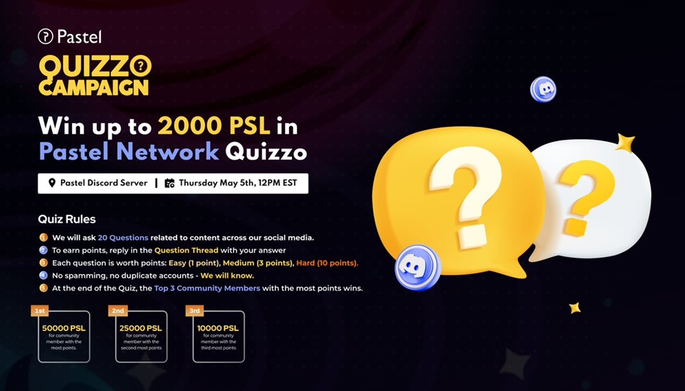 👋FRENS!!!! ITS QUIZZO TIME! ⁉️❓❔Join us for Quizzo on Thursday, May 5th at 12pm EST in the Quizzo! Channel on the Pastel Network Discord Server. Test your knowledge on our social media content with 20 questions worth points. Top 3 winners receive PSL prizes! See you there! 🎉