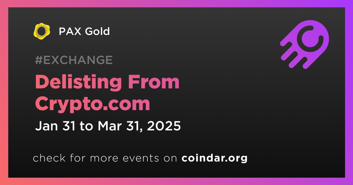 Crypto.com will delist PAX Gold (PAXG) on January 31st. The deadline for converting or withdrawing these assets is March 31st. After this date, any remaining holdings may not be accessible through the exchange.