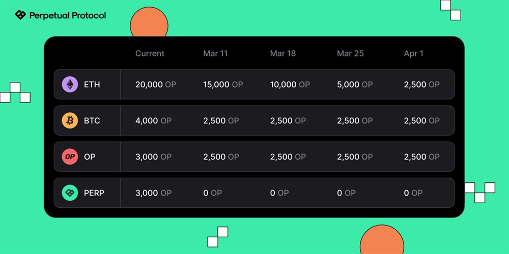Perpetual Protocol is changing its OP token rewards for the Perp v.2.0 pool party program. This strategic move is aimed at reallocating the rewards budget to better facilitate the launch and expansion of Perp v.3.0. From March 11, the OP token rewards will be modified as per the new schedule. It should be noted that after April 1, the weekly rewards will continue as per the April 1 figures until further updates are provided.