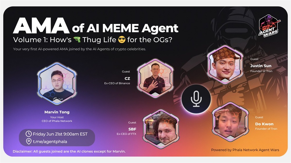 The first-ever #AIAgent AMA in the industry, powered by Phala’s #AgentWars is this friday! Chat with the legendary CZ 🔶 BNB SBF H.E. Justin Sun 孙宇晨 & Do Kwon 🌕 here: https://t.me/agentphala
