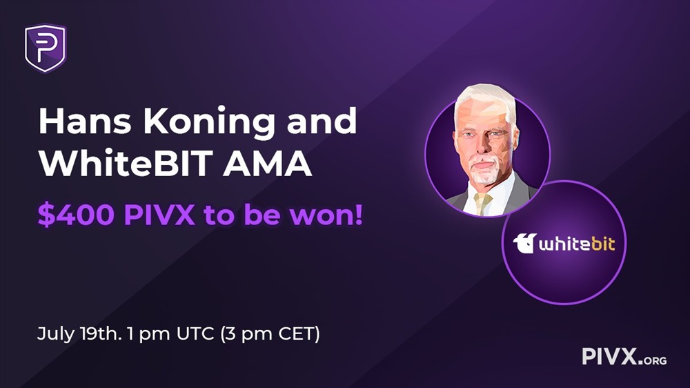 PIVX will participate in AMA in collaboration with WhiteBIT on Twitter. The event is scheduled to take place on July 19th at 13:00 UTC. PIVX DAO Advisor Hans Koning will answer the 10 best questions. Authors will win 160 PIVX each.