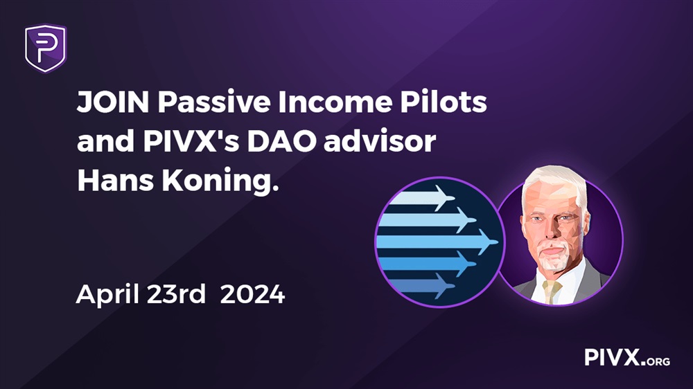 Join us on april 23rd for a power-packed podcast episode with Passive Income Pilots Passive Income Pilots, and Hans Koning - 🧙♀️ - DAO & web3 advocate Hans Koning, #PIVX's #DAO advisor. 🎉Rapid-fire questions on #blockchain, #crypto, and beyond.🚀