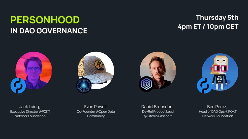 Pocket Network will host an AMA on X on October 5th on the topic of personhood in DAO governance. The speakers for the event include Daniel Brunsdon from Gitcoin Passport, Evan Powell from OpenData, and Pocket Network’s own Jack Laing. The discussion will delve into the complexities and nuances of personhood in the context of decentralized autonomous organizations (DAOs).
