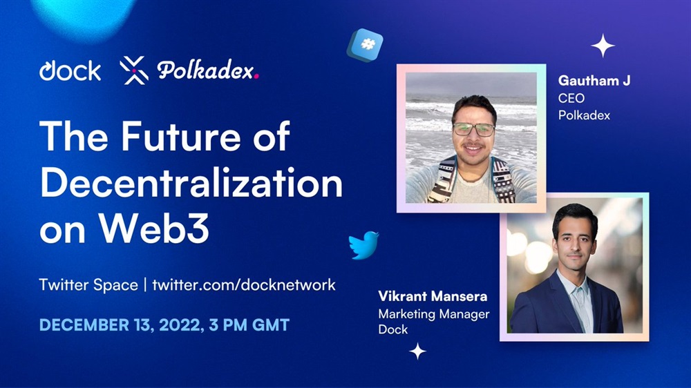 🙌 Our friends at @docknetwork are hosting @gauthamastro for a live Spaces session on the future of #Decentralization in #Web3 🥳