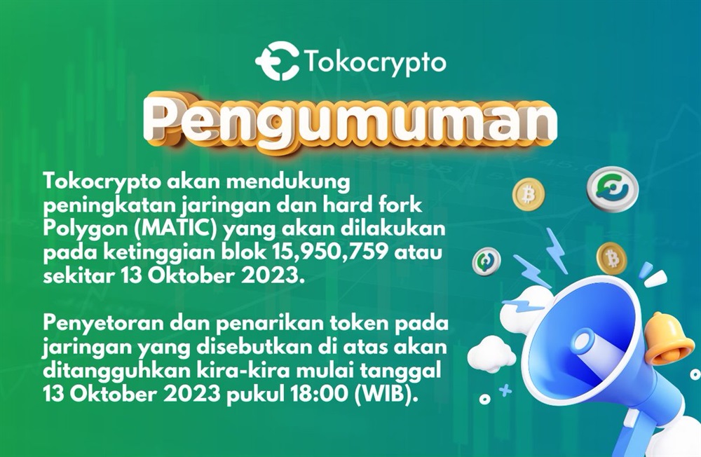 Tokocrypto akan mendukung peningkatan jaringan dan hard fork Polygon (MATIC) yang akan dilakukan pada 13 Oktober 2023 pukul 18:00 WIB.