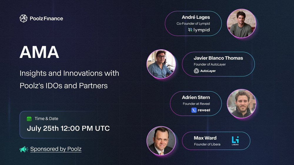 Poolz Finance will host an AMA on X featuring four innovative DeFi founders from AutoLayer, lympid Official, and LIBERA GLOBALAI. The event is scheduled to take place on July 25th at 12 pm UTC.