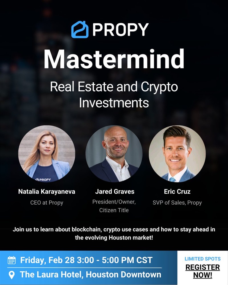 Propy will host the Mastermind event “Real Estate & Crypto Investments” on February 28th from 21:00 to 01:00 UTC in Houston. The event aims to discuss blockchain and cryptocurrency use cases and strategies to navigate Houston’s evolving real estate market.