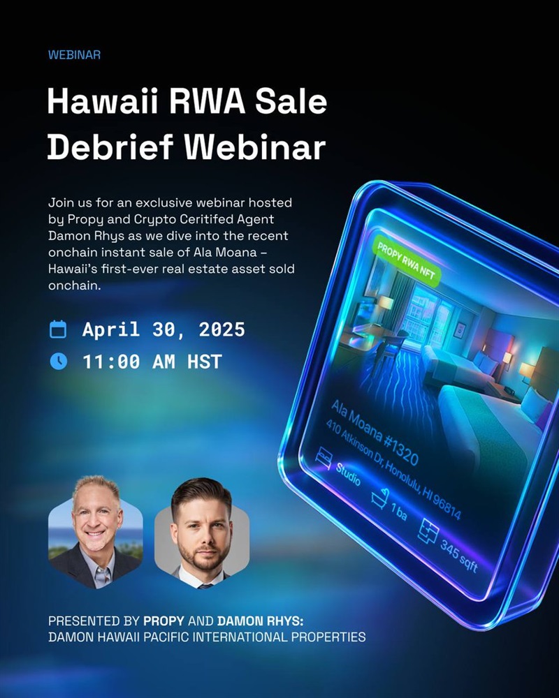 Propy and crypto-certified agent Damon Rhys will conduct a webinar on April 30 into the details of Hawaii’s first on-chain property closing. The property, Ala Moana #1320, was sold without traditional escrow, paperwork, or title delays, marking a significant milestone in real estate transactions.