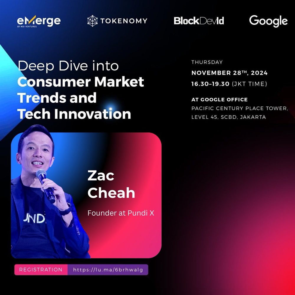 #PundiX Founder Zac Cheah will be speaking at the "Deep Dive into Consumer Market Trends and Tech Innovation" event at Google's office in Indonesia, organized by eMerge, Tokenomy and BlockDevId 🇮🇩