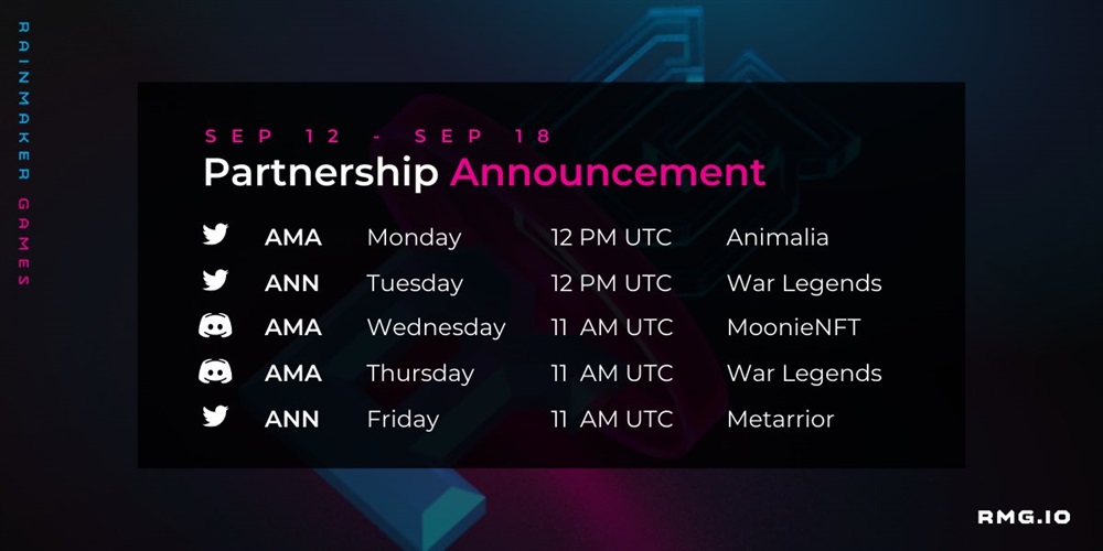 ☔️ Hello, Rainmakers! It is now Monday, which means that it is now the perfect time for you to be kept up to date about our Weekly Partnership announcement. This week will be just as busy as last, so make sure to join us for the upcoming AMA’s
