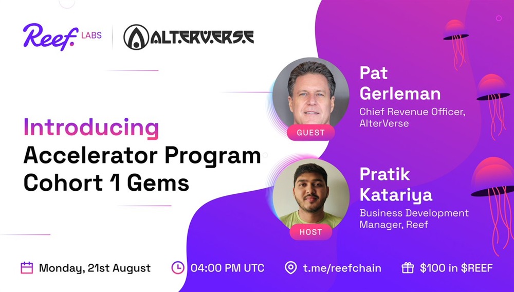 Reef will host an AMA on Telegram with AlterVerse. AlterVerse is a game creation ecosystem that utilizes the unreal engine, artificial intelligence, and 3D environments among other technologies. The introduction of this cohort is scheduled for August 21st at 4 pm UTC.