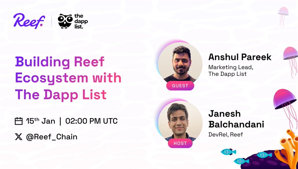 Reef is partnering with The Dapp List for an AMA on X on January 15th at 14:00 UTC. The focus of this session will be on the development of the Reef ecosystem in collaboration with The Dapp List.