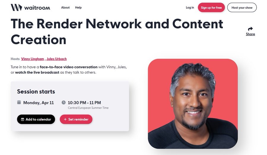 Join $RNDR CEO @JulesUrbach Monday, Apr 11 with @VinnyLingham CEO @usewaitroom and general partner @multicoincap.